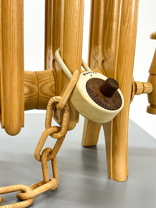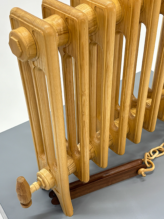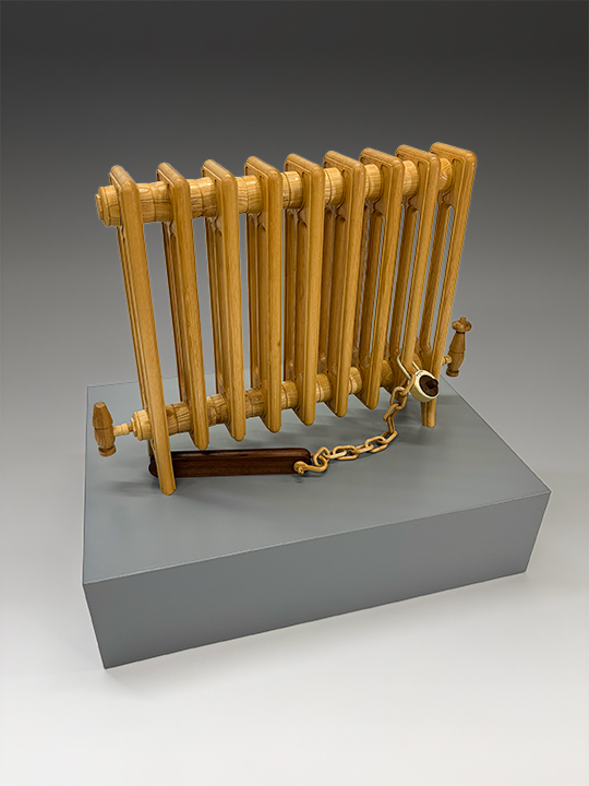 This sculpture is the first in a series of works to be grouped under the label Architectural Salvage, or maybe just Salvage. This work, like most of the sculpture I make, seems to be a pointer to what’s happening. As succinctly as I can express this in words is, this work points to the problem of self-identification. Anyone who considers themselves a seeker of truth or reality, or something like, that will probably recognize some direct connections between the language used to describe what we as human beings are doing to cause the suffering we experience…albeit in a symbolized way here. There is a mechanism of attachment and there seems to be a heavy object to attach to. There is something getting attached, which is the physical manifestation of a negative space in the thing being grasped, i.e. the radiator. The walnut object at the end of the chain is as close as could be carved in shape to a/the negative space in one of the rungs of the radiator. This seems to be what we are doing as people.